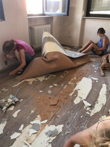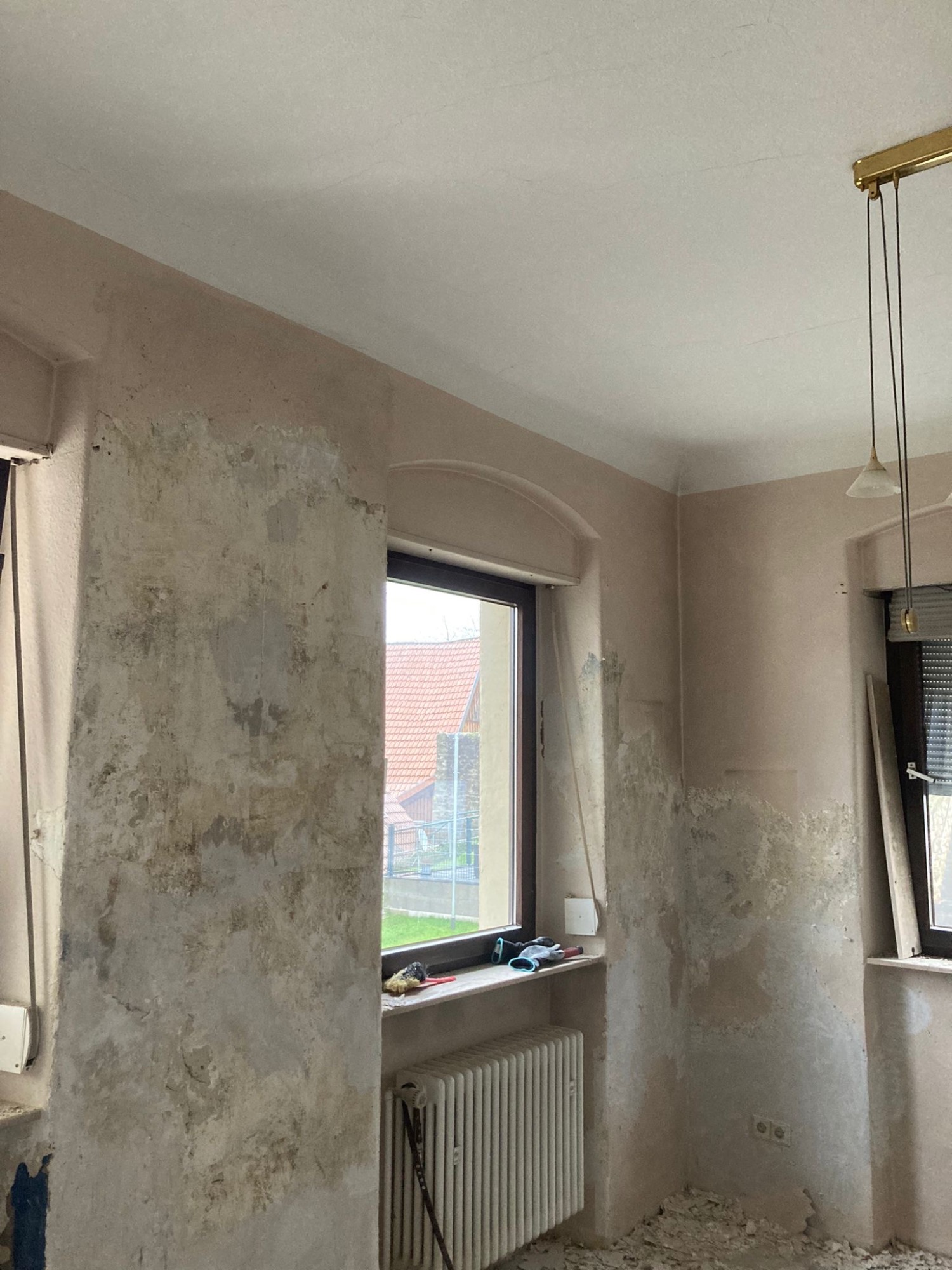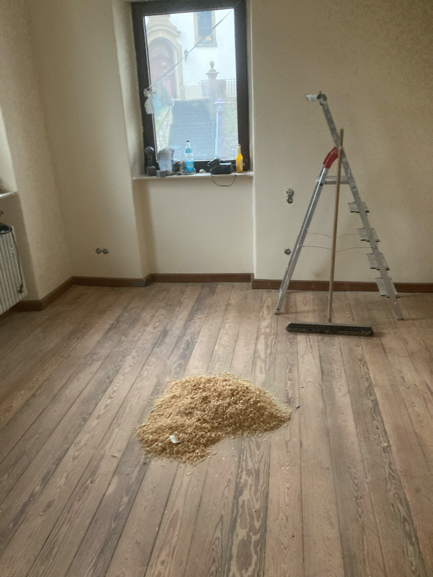 Auch der Beratungsraum wurde umfassend erneuert und neu gestaltet. Zunächst wurden Teppichböden und Pressspanplatten entfernt, sodass die ursprünglichen Böden wieder freigelegt werden konnten. Die Wände wurden von alter Tapete befreit und sorgfältig neu aufgearbeitet.