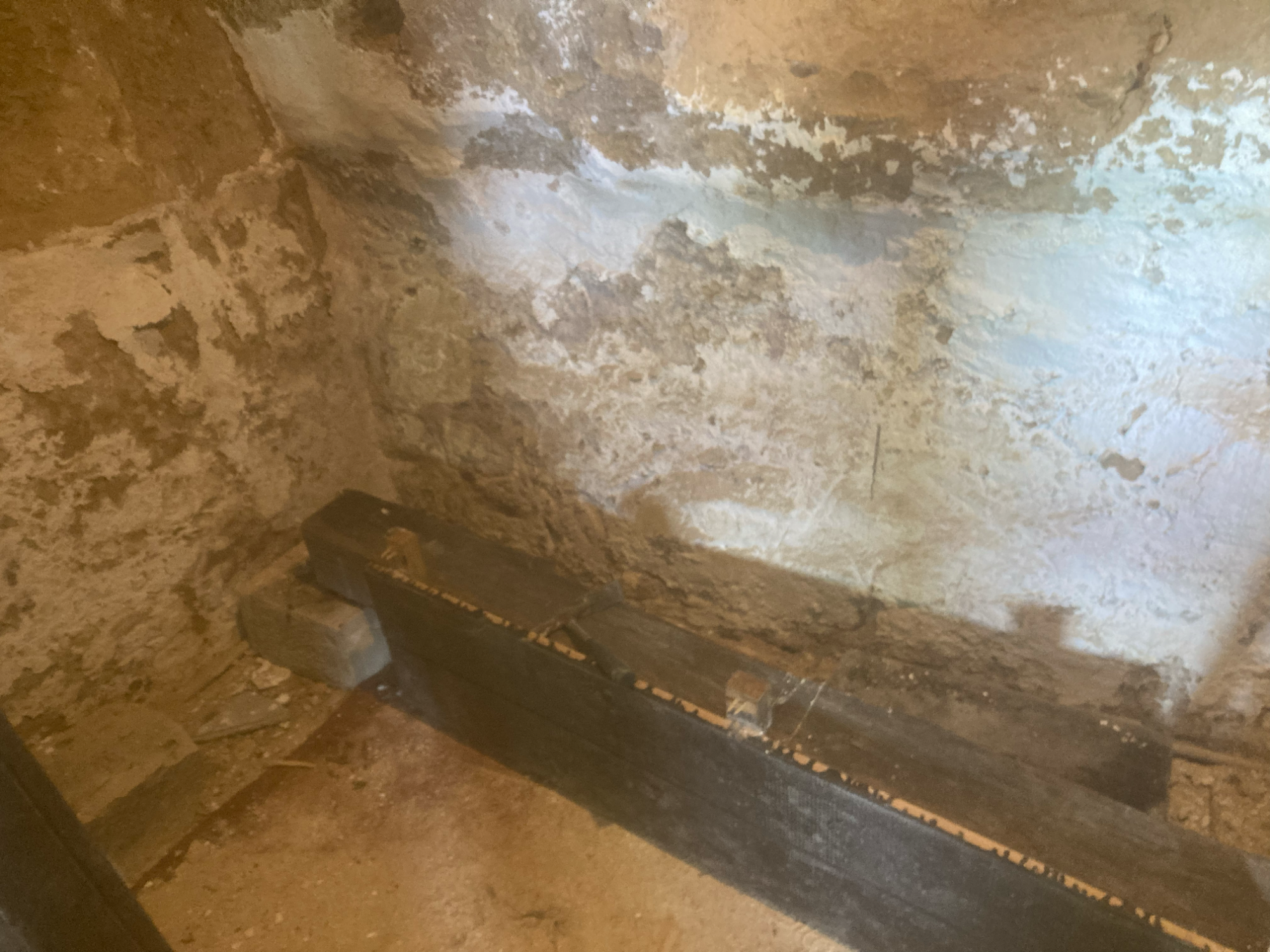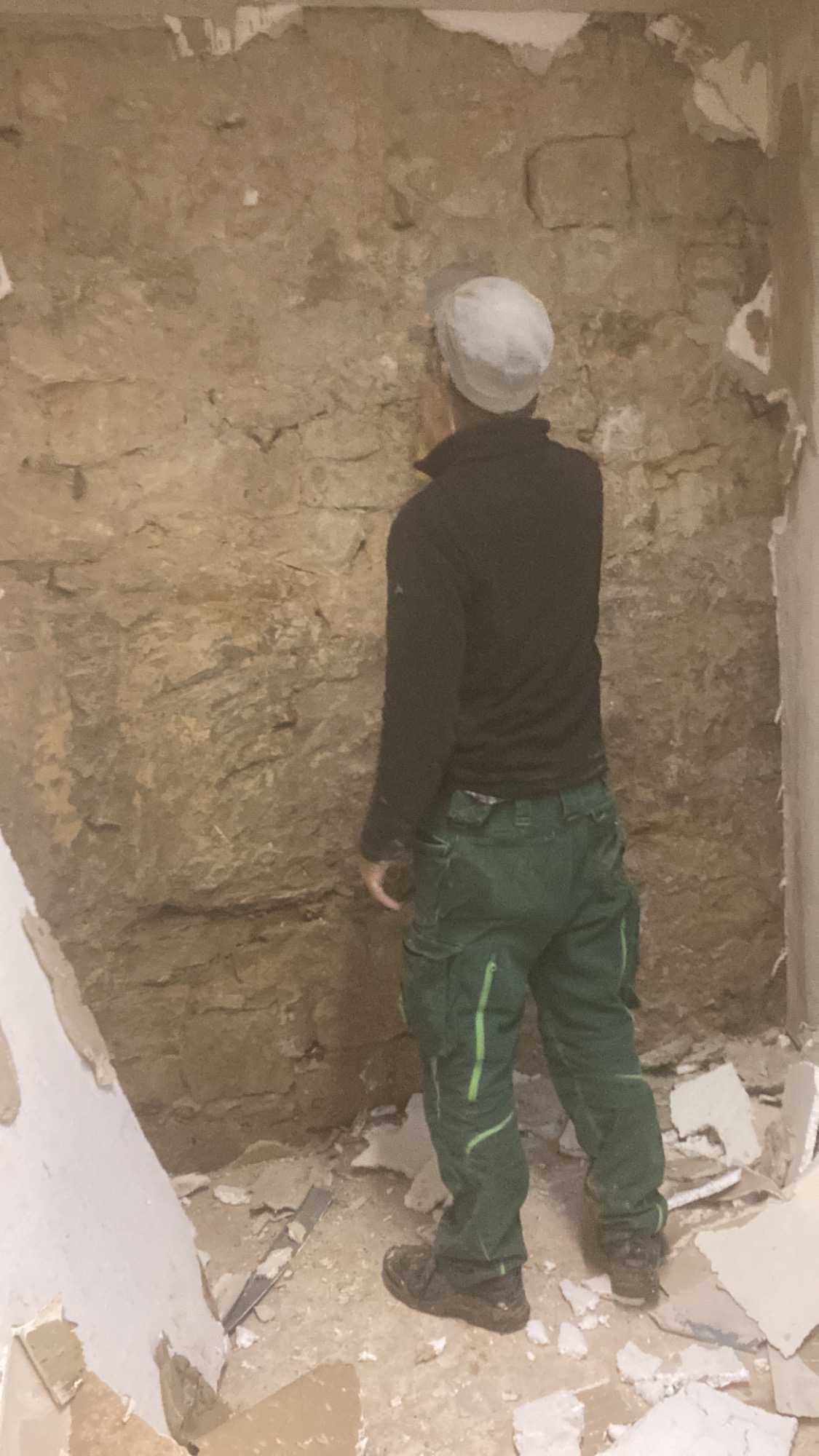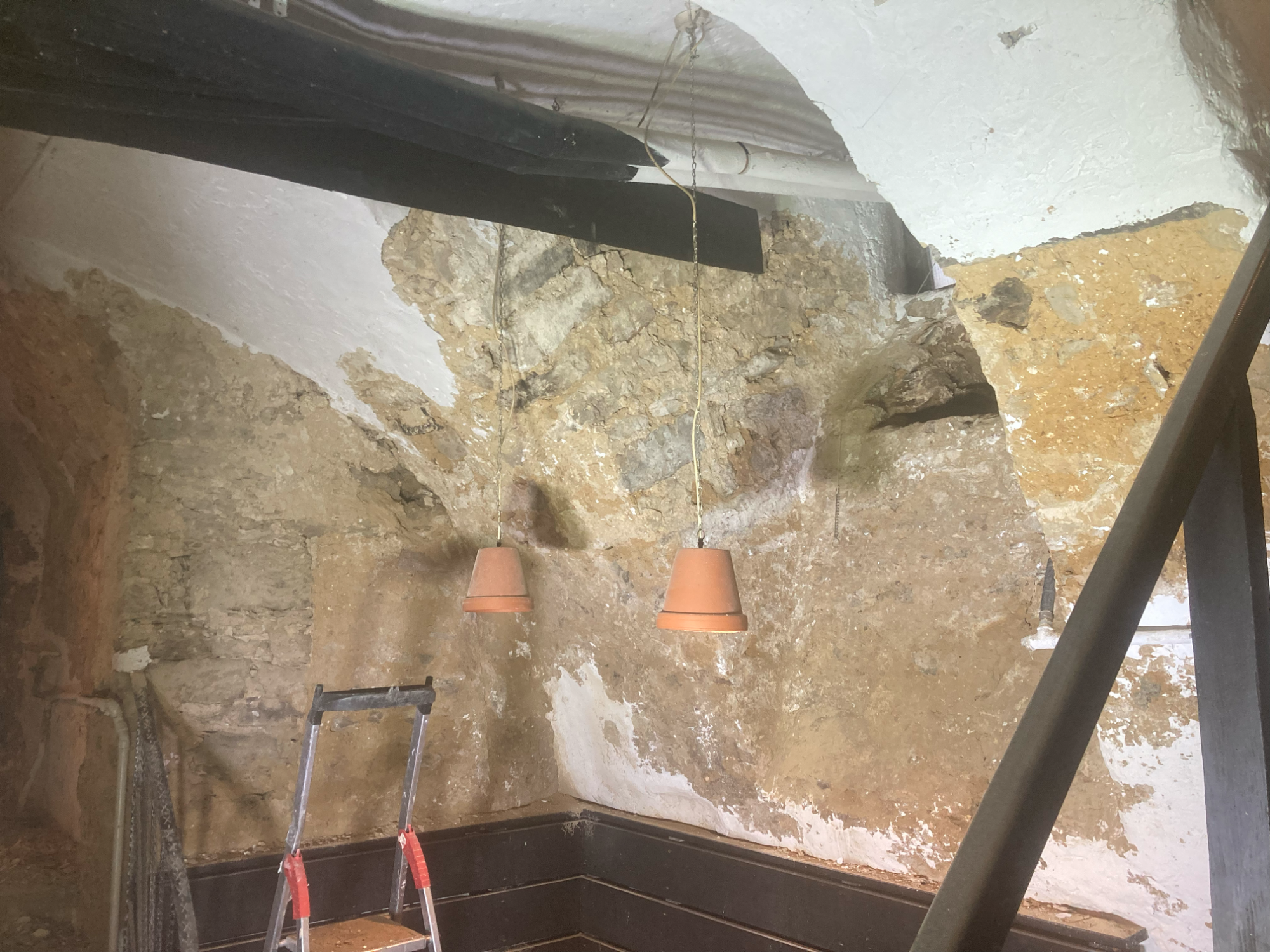 Der unpassende Putz wurde vollständig abgeschlagen, damit die Wände aus Sandstein wieder atmen und trocknenkönnen. Auch alte Bänke und Wandverkleidungen wurden entfernt, um die Substanz des Raumes freizulegen und langfristig zu erhalten.
