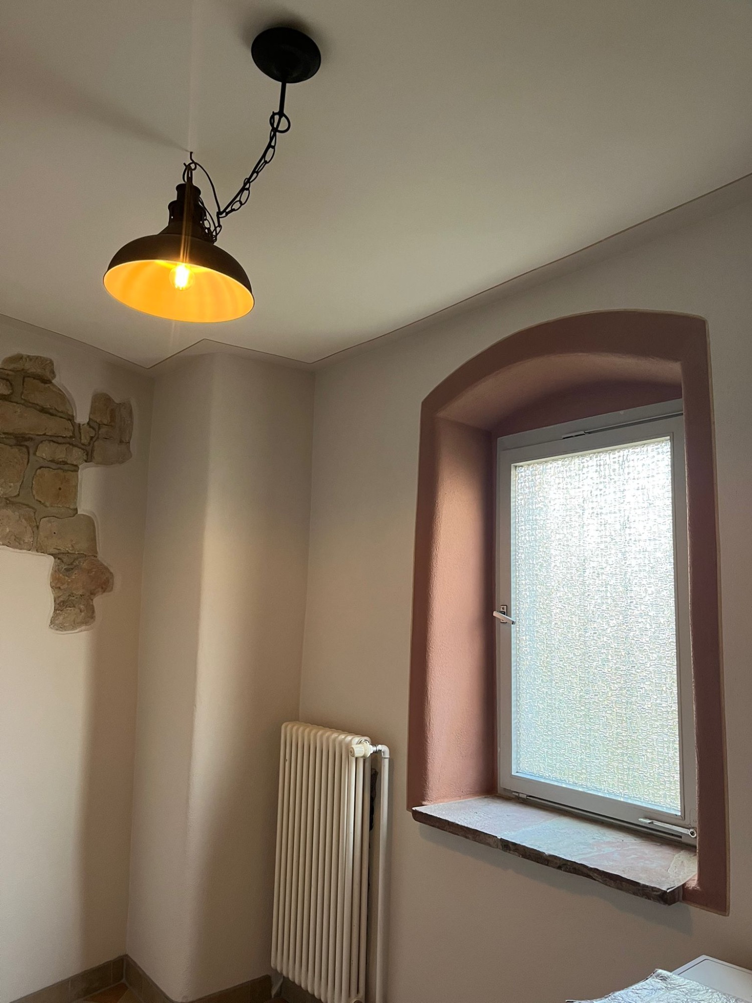 Um den ursprünglichen Charakter des Gebäudes zu bewahren, wurde ein Teil der freigelegten Sandsteinwand bewusst sichtbar gelassen. Heute verbindet der Raum historischen Charme mit neuer Funktionalität und bietet einen inspirierenden Ort für kreatives Arbeiten und Gestalten.