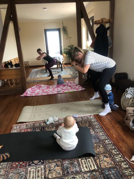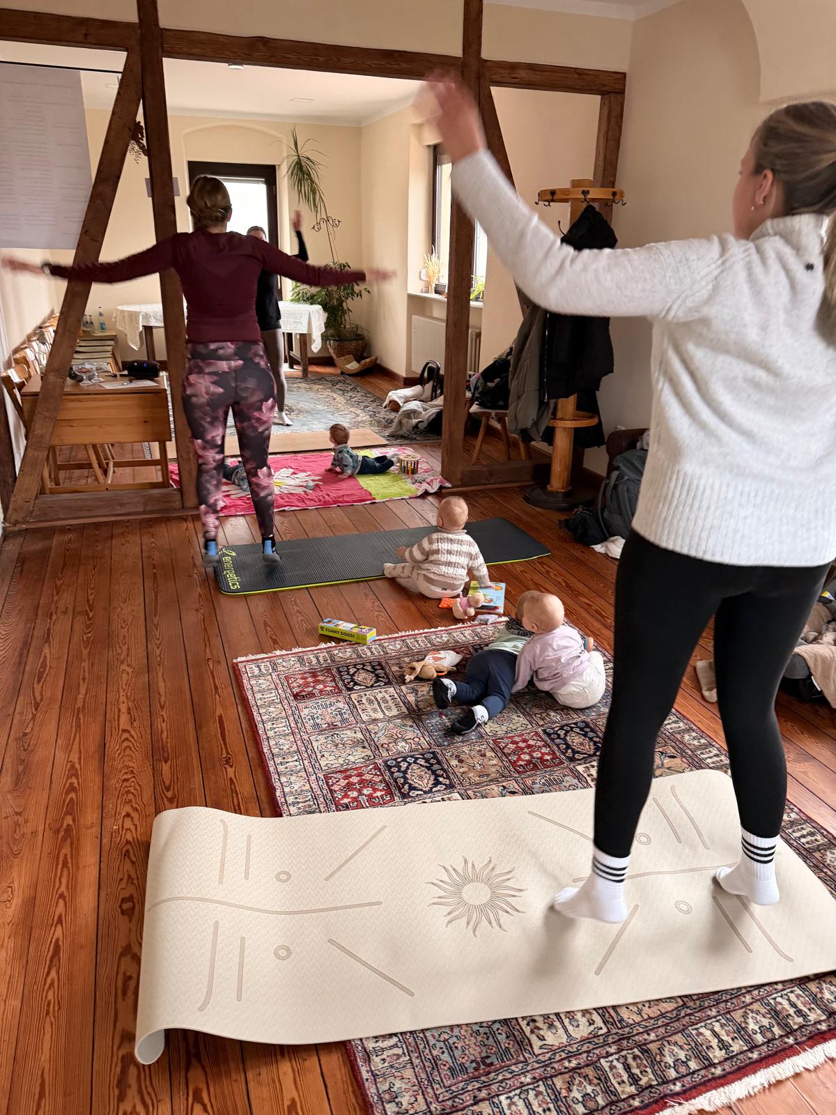 Beim „MamaMove“ halten Sneschana und Lisa Mütter gemeinsam mit ihren Babys fit. Die abwechslungsreichen Trainingseinheiten verbinden Elemente aus Yoga, Krafttraining und Cardio und stärken sowohl den Körper als auch das eigene Wohlbefinden. Die Babys sind fester Bestandteil des Angebots und werden – je nach Entwicklungsstand – auf der Matte, in der Trage oder spielerisch in die Übungen integriert.