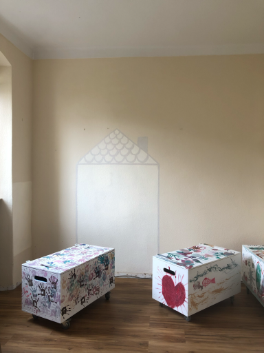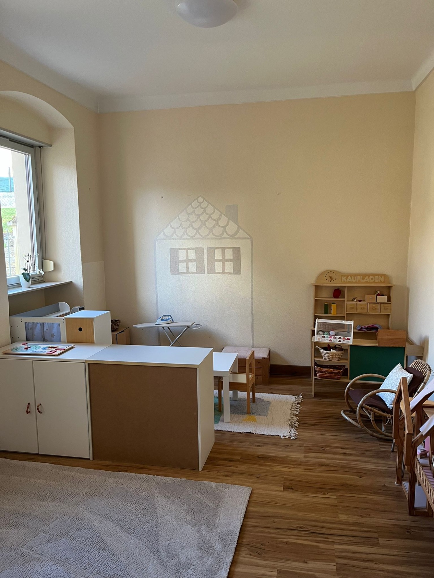 Das Rollenspielzimmer wurde grundlegend neu gestaltet, um einen kreativen und einladenden Raum für Kinder zu schaffen. Da hier kein ursprünglicher Holzboden vorhanden war, wurde ein neuer Boden verlegt. Zuvor wurden die alten Teppichböden entfernt, die Wände neu gestrichen und der Raum insgesamt aufgearbeitet.