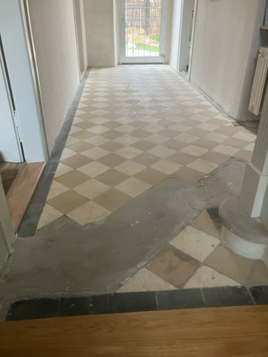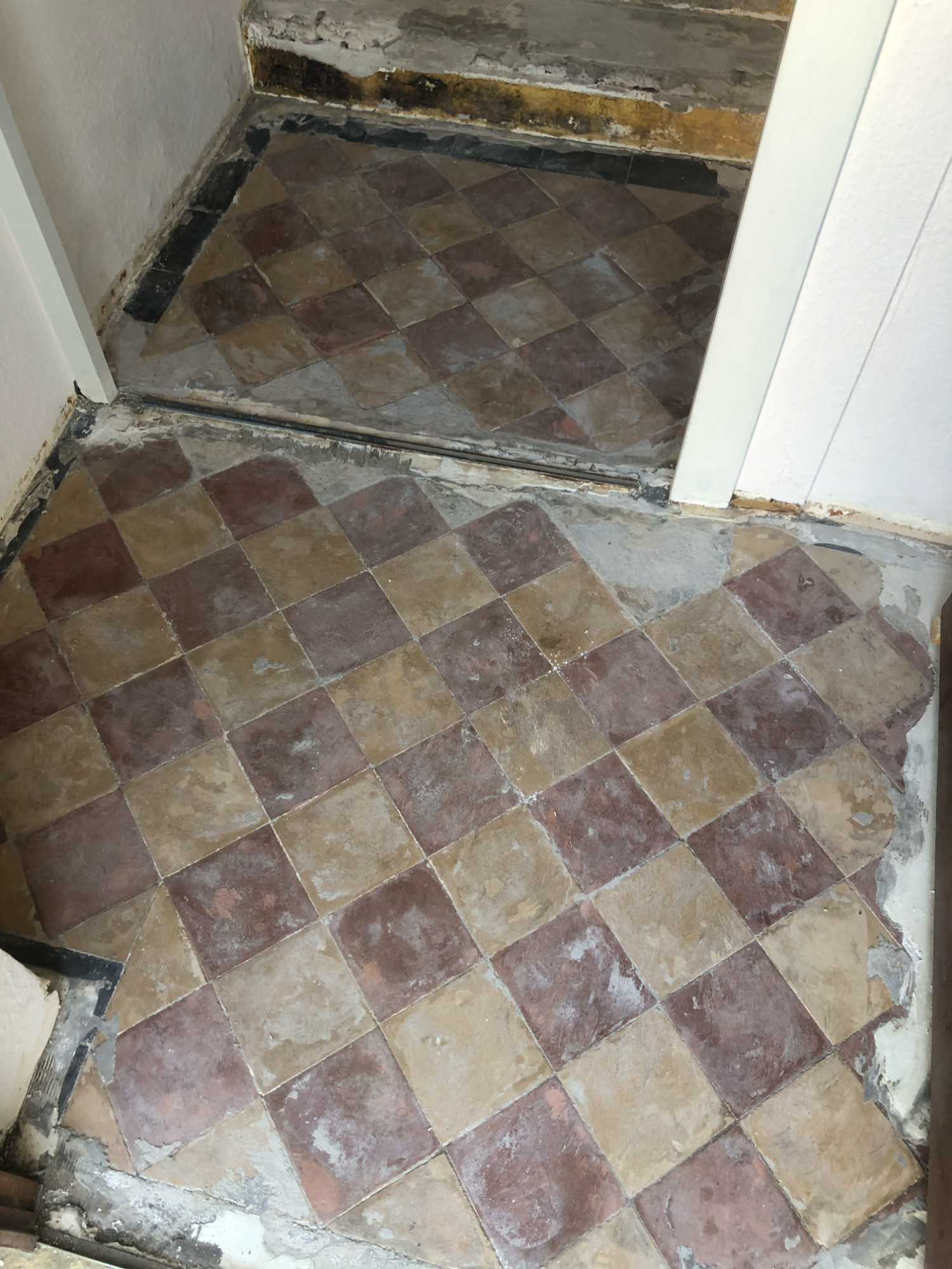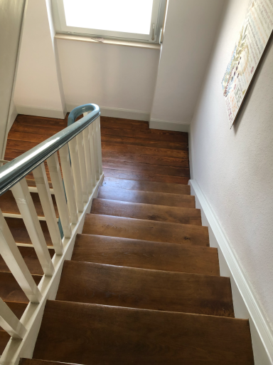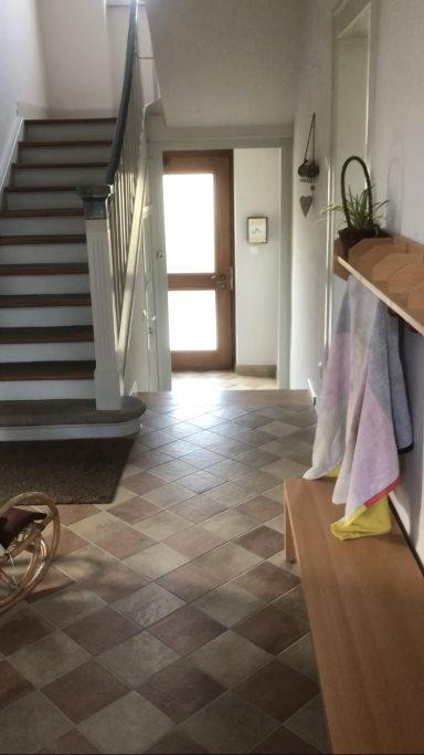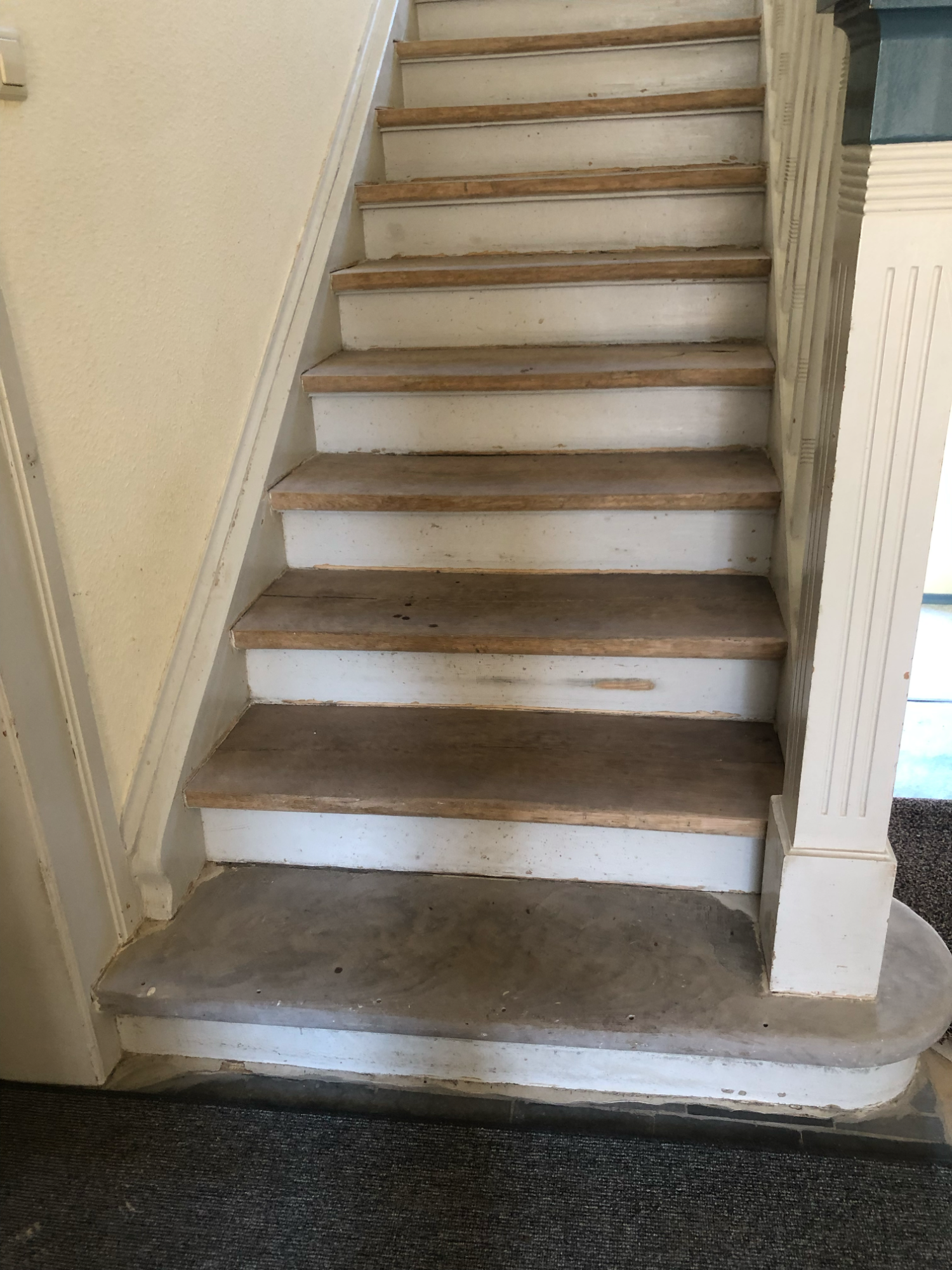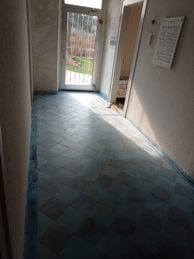 Die Treppenabsätze wurden von alten Pressspanplatten befreit, das gesamte Treppenhaus sowie der Flur neu gestrichen und damit deutlich aufgewertet.