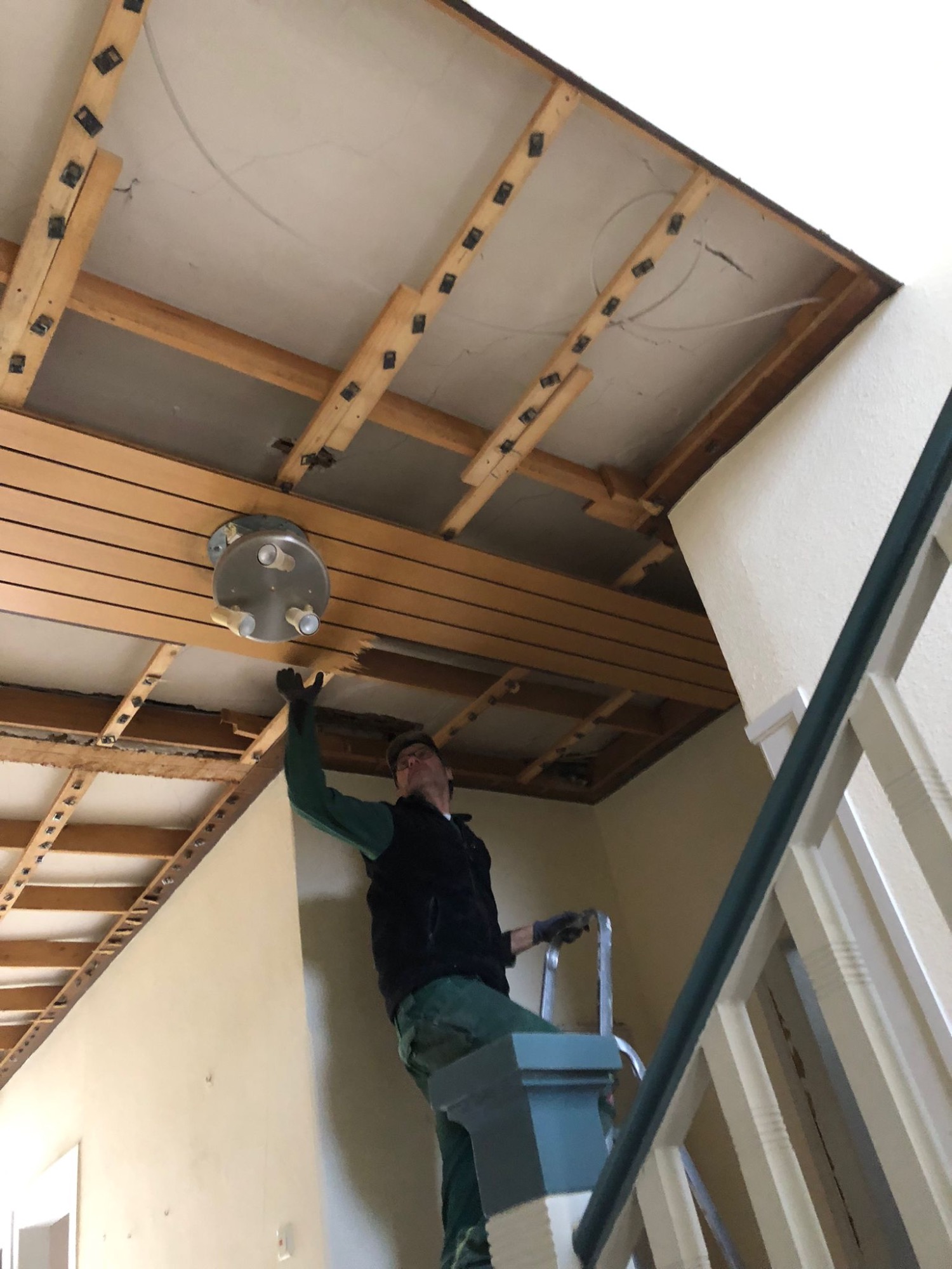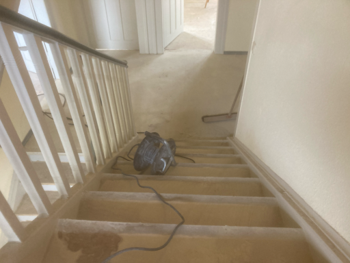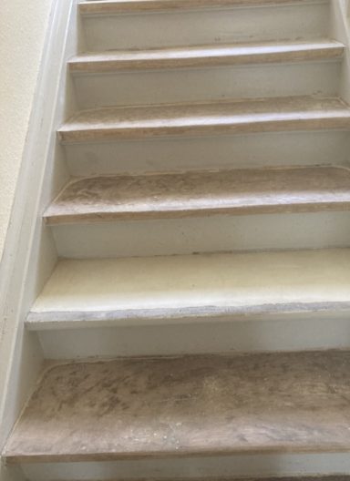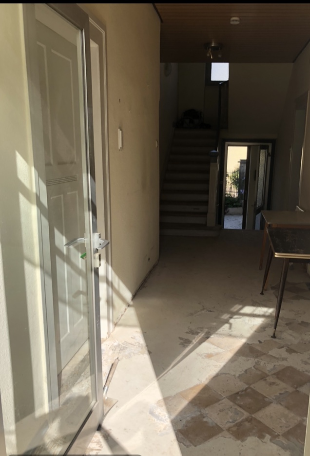 Auch im Innenbereich wurde das Gebäude Schritt für Schritt erneuert. Im Treppenhaus wurden zunächst alte Bodenbeläge wie Teppich- und Vinylböden entfernt, der darunterliegende Kleber abgeschliffen und die Holztreppe sorgfältig aufgearbeitet. Nach dem Schleifen erstrahlt sie nun frisch gestrichen in neuem Glanz.