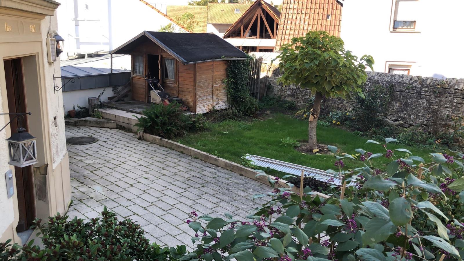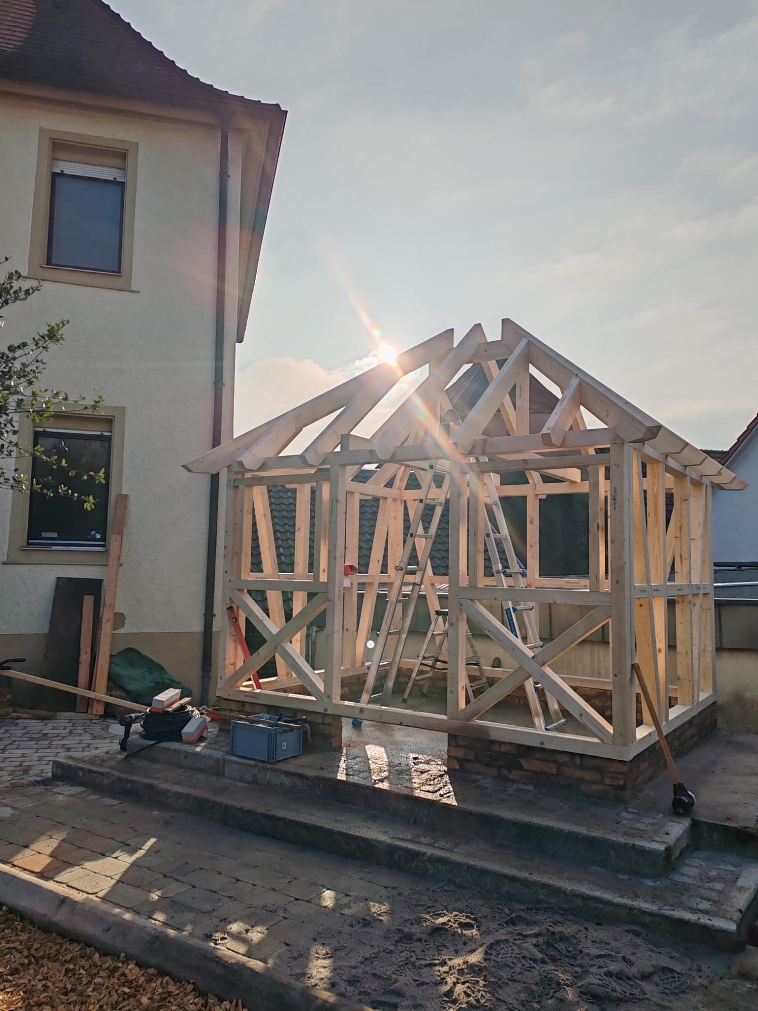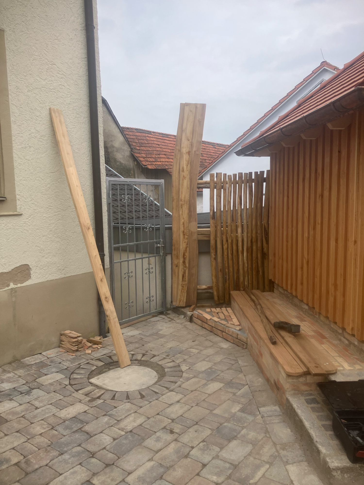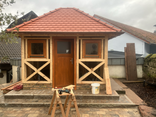 Auch der Vorgarten hat sich deutlich verändert. Eine alte, marode Hütte wurde abgebaut und durch eine neue, stabile Hütte ersetzt. Sie dient nun als Ort zum Werken und als Unterstand für die Fahrzeuge der Kinder.